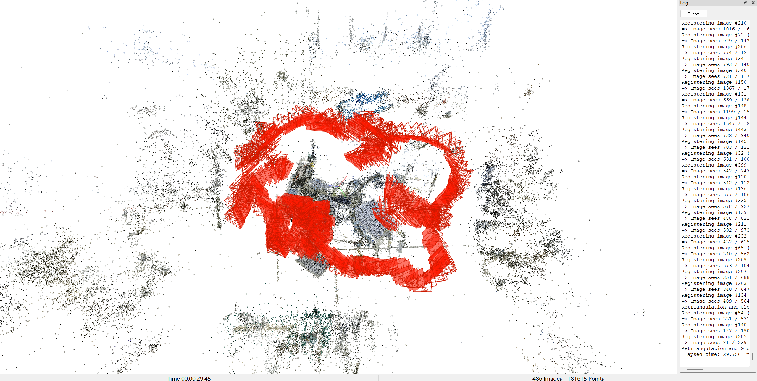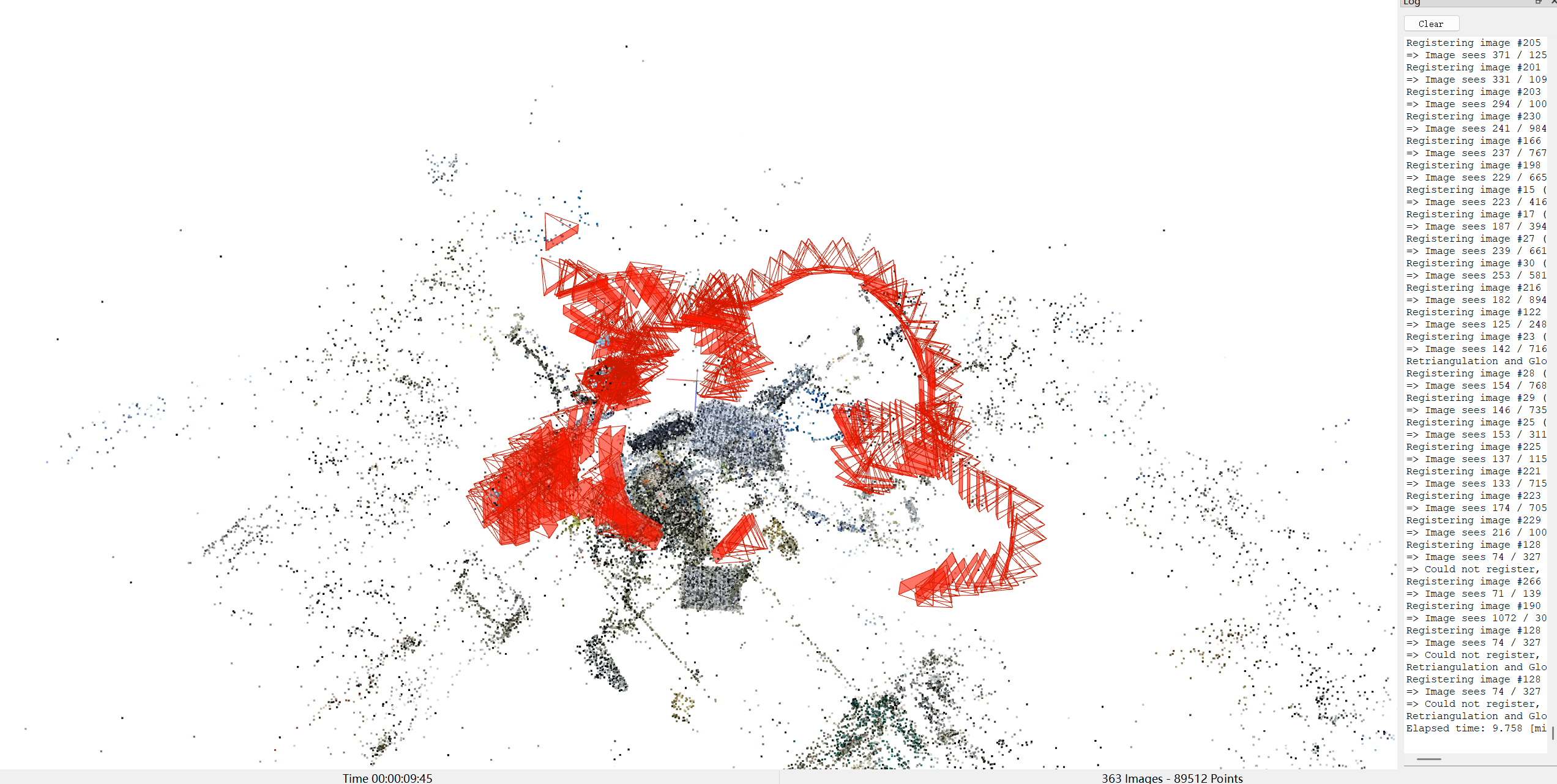 Conversely, a poor reconstruction is evident when the camera track breaks off, and many cameras are inaccurately clustered, pointing in wrong directions. Such misalignment indicates incorrect camera positioning, which can severely impact subsequent processing. Results of Gaussian Splatting on both good and poor reconstructions will reveal stark contrasts.