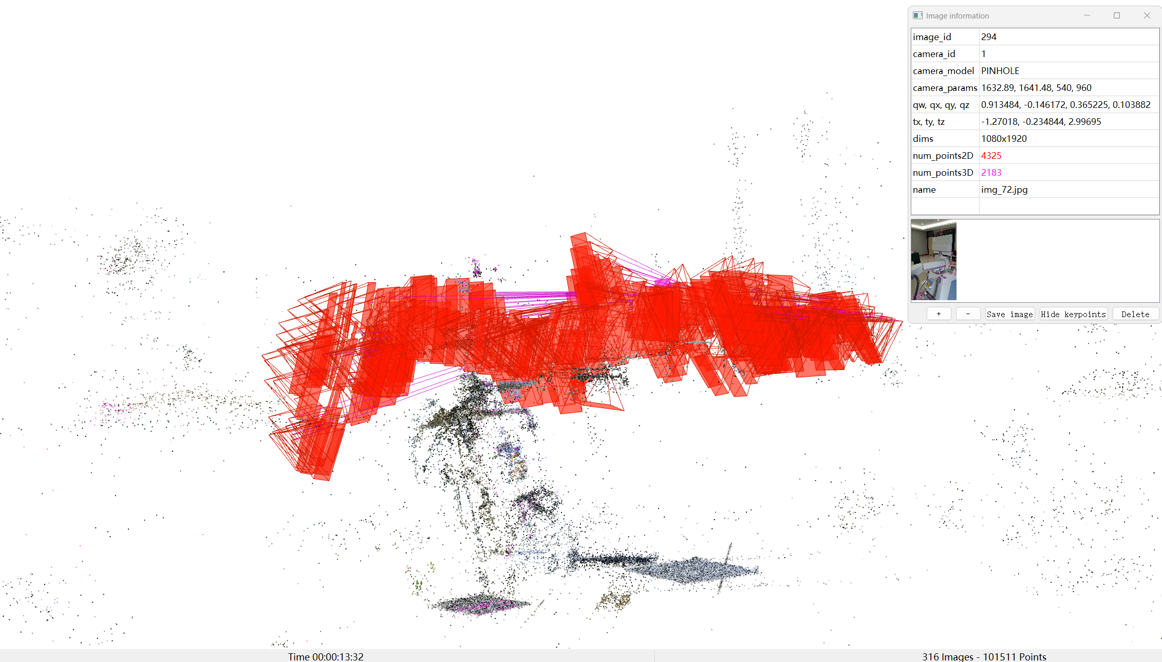 While the video is recorded at 30 fps, meaning even a short video contains thousands of images, my laptop lacks the necessary hardware to handle the processing workload for such a large number of images, as this volume overwhelms its limits. After some experimentation, I found it acceptable to use only one out of every 15-20 frames. The downside of this sparse sampling is discussed later in the results section.